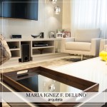 No Home trabalhamos com um painel de laca e vidro na TV e um painel ripado de madeira clara na lateral com nichos que abrigam as lembranças de viagens da proprietária. Este painel também esconde a porta do lavabo.